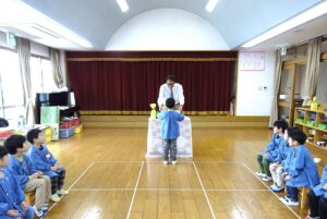 安全協会の方が来園され、本日本年度2回目の交通安全教室を開きました。楽しくわかりやすく「命」