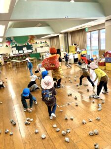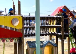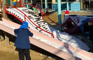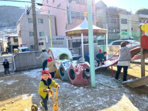 あまり雪が積もらない地域ですが、今朝は遊具などに雪が積もっていて、雪を集めてあちこちで雪遊びが始まりました。通勤される方は大変でしょうが、子どもたちは雪が大好きです。