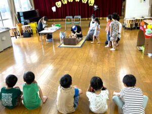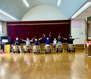 お誕生日会をしました。お祝いに年中・年長の園児さんたちが和太鼓を披露してくれました。新作です。