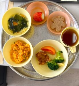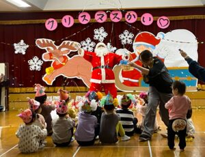 明日からお休みの園児さんもいることから、今日クリスマス会をしました。クイズで「クリスマスは何の日? ➀イエスキリストという人の誕生をお祝いする日、②パーティーをする日、③先生の誕生日、③はさすがにいませんでしたが、②はけっこうな数の園児さんがいました。巷の話で聞いたことがありますが、サンタさんは知ってるけど。。。時代ですかね。今日の給食はみんなの大好きなクリスマスメニューでした。