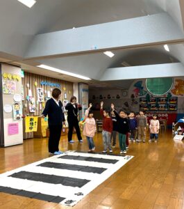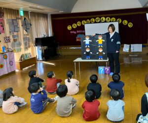 を守るための交通ルールを教えていただきました。年長さんはあと3ヶ月で小学校の「通学」が待っています。今までのことをしっかり思い出して安全に通学できたらいいですね。協会の方、ありがとうございました。