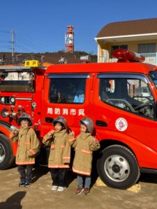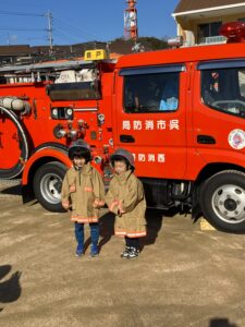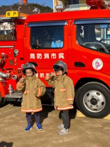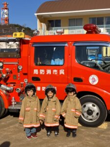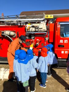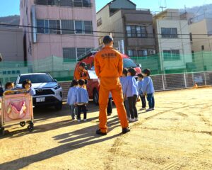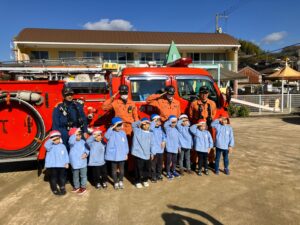 年12回避難訓練をしていますが、今回は音戸消防署のご協力を得て自衛消防訓練をしました。園児さん、先生方も消防士さんからいろいろ教わり、最後園児さんたちは、消防車・レスキュー車についてたくさん教えてもらったり、消防服を着させてもらったり、運転席に乗せてもらったり、わくわく、ドキドキの訓練でした。消防士のみなさんありがとうございました。